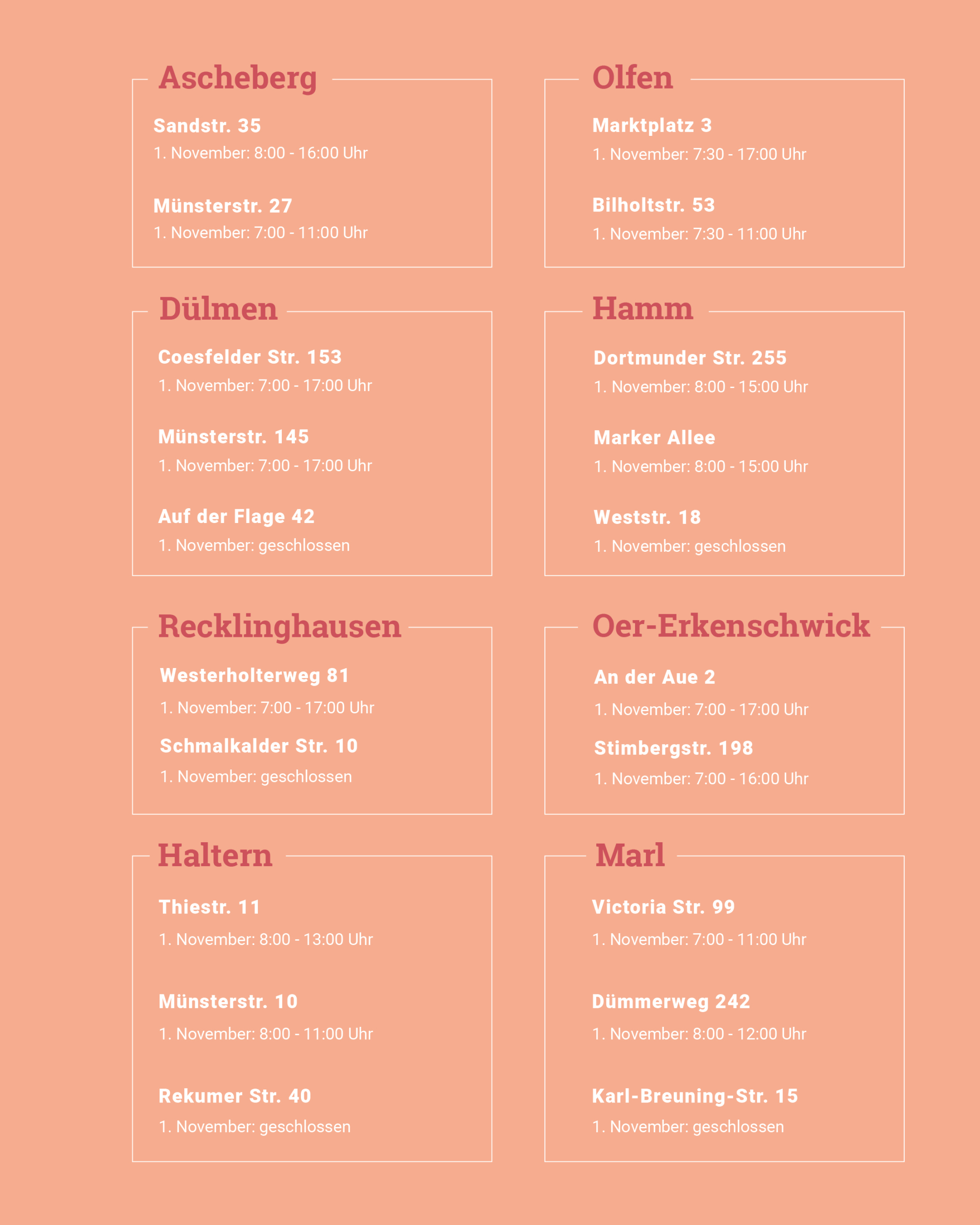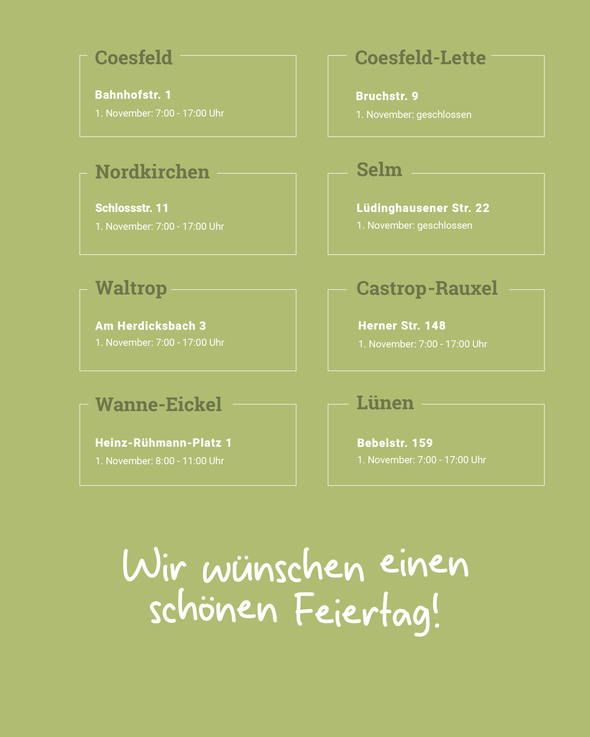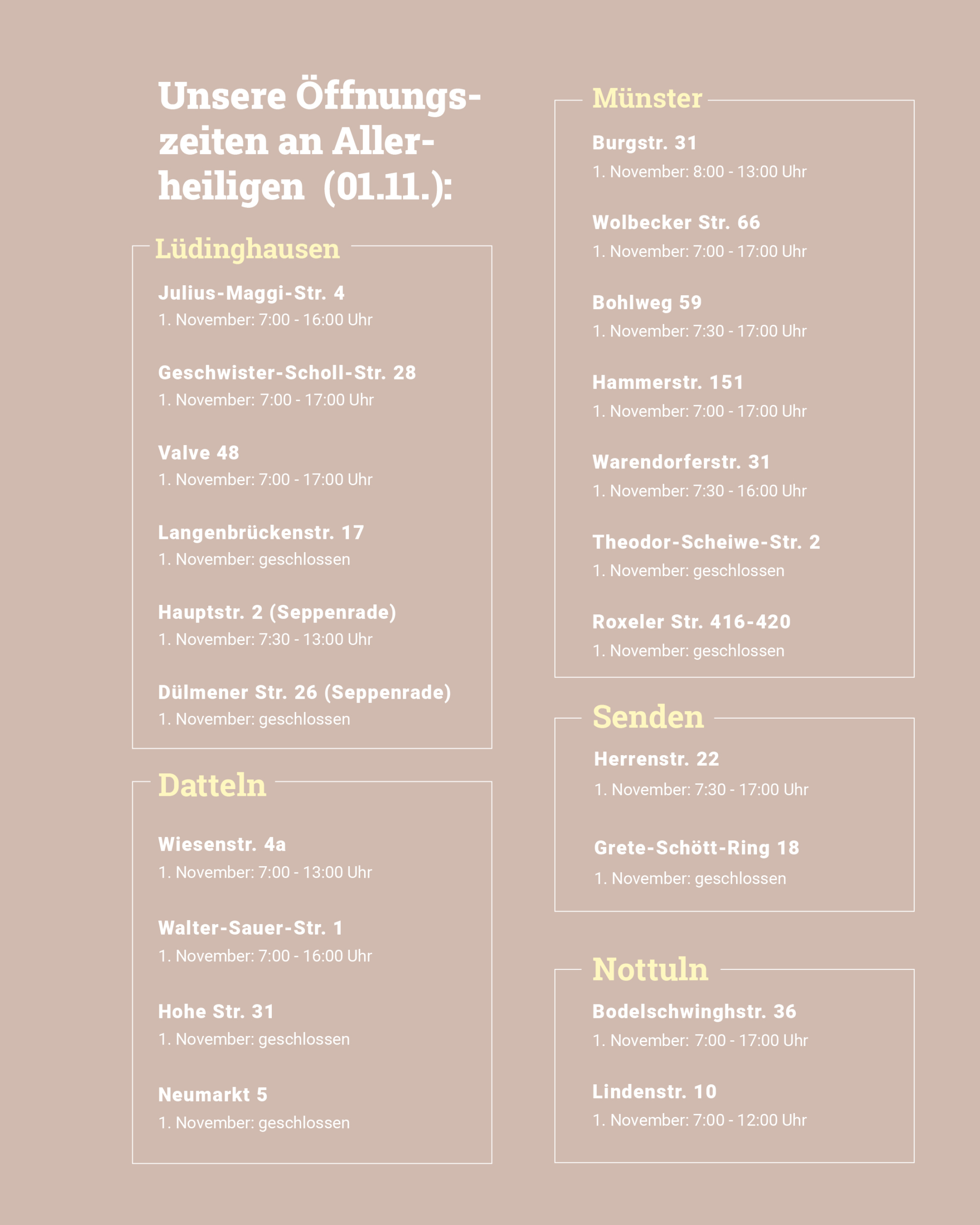 Hier findet ihr unsere Öffnungszeiten am 1. November.