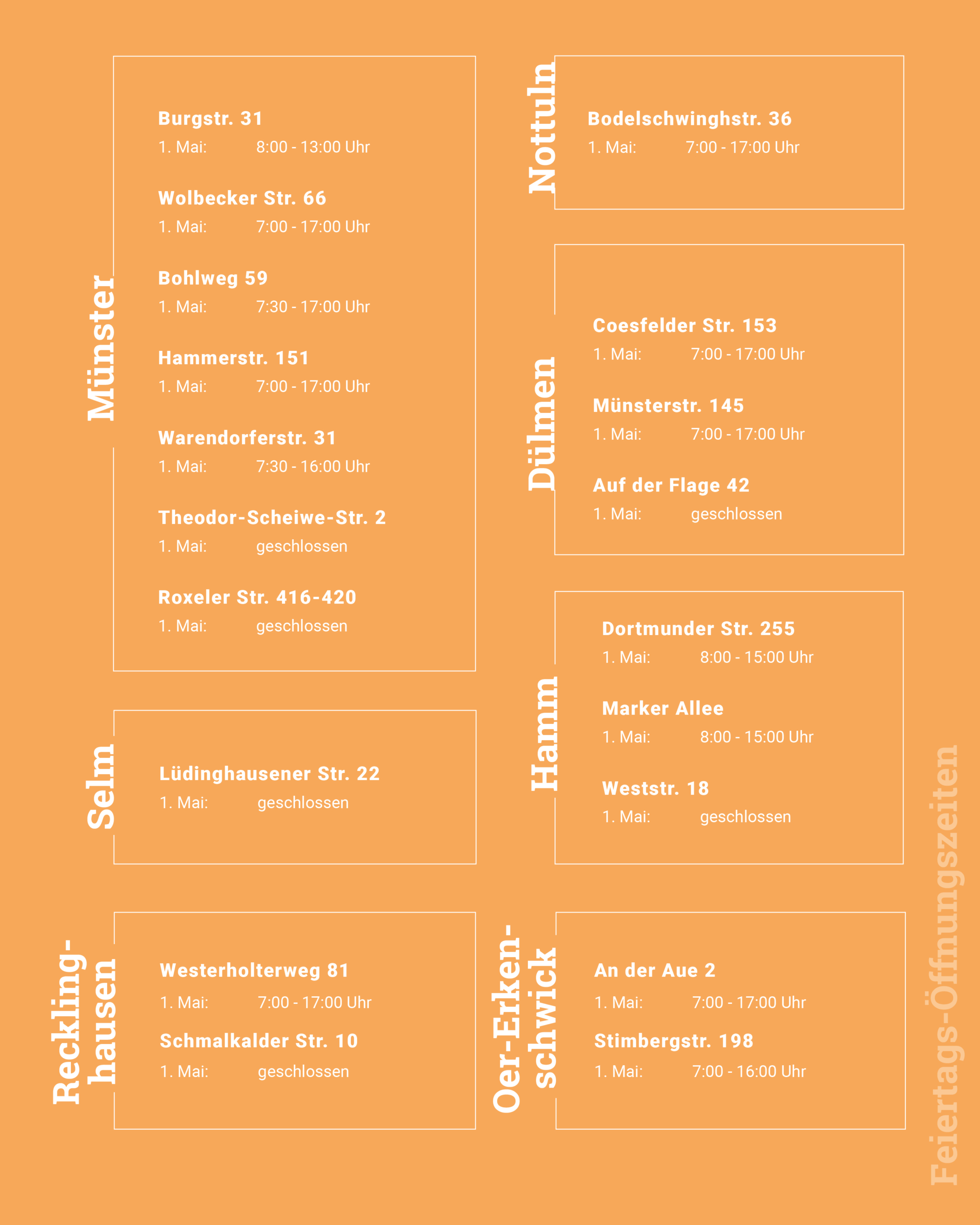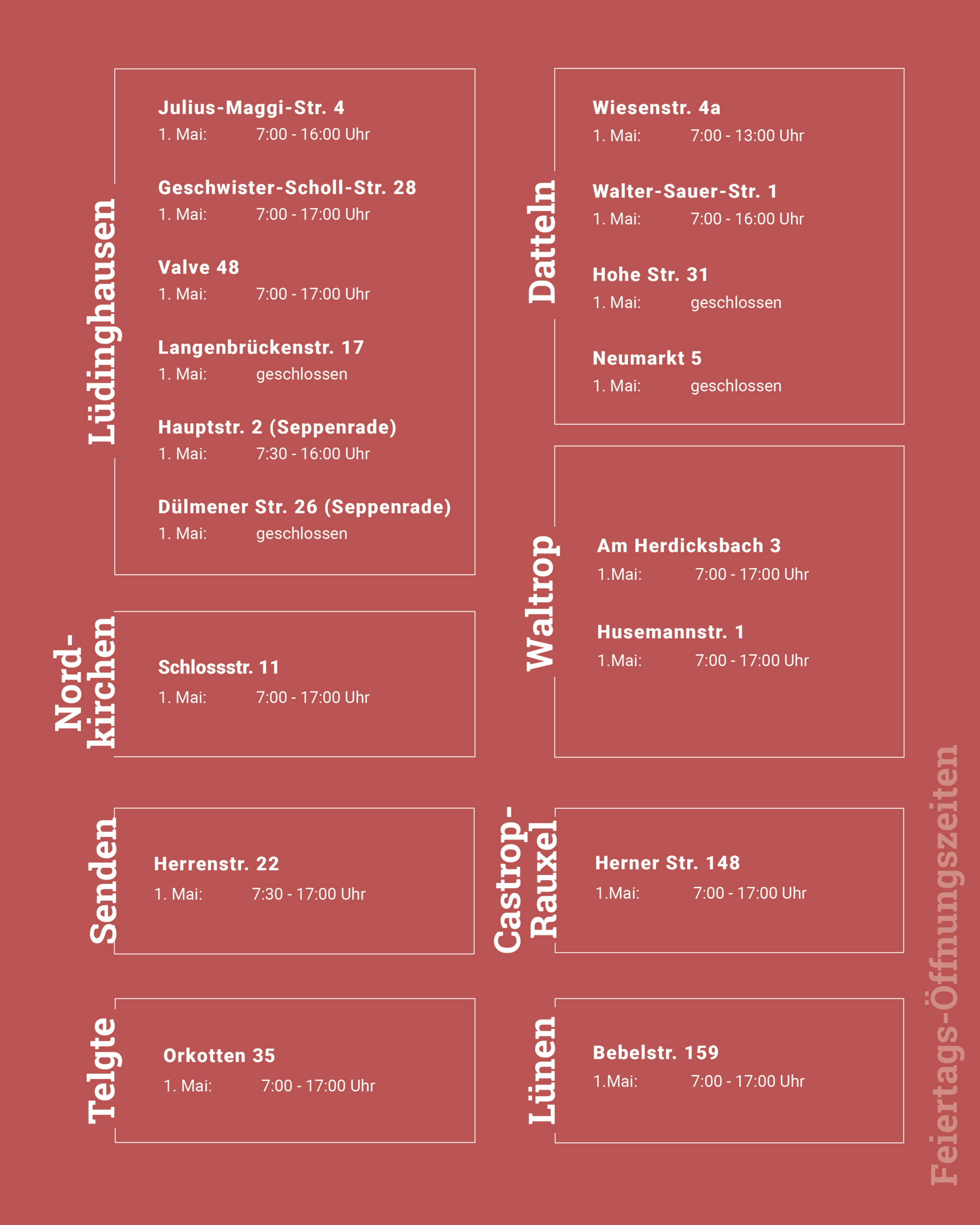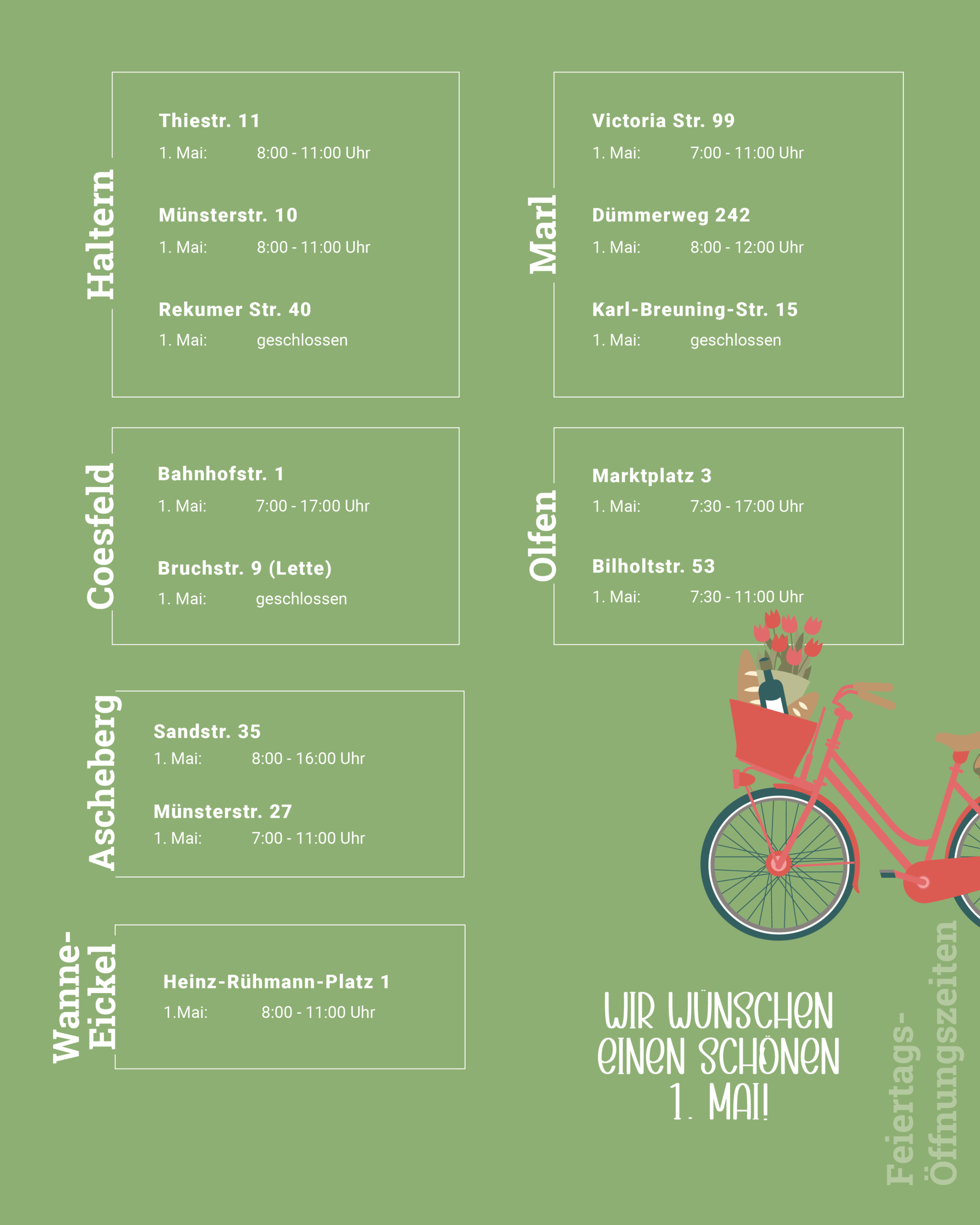 Hier findet ihr unsere Öffnungszeiten am 01. Mai